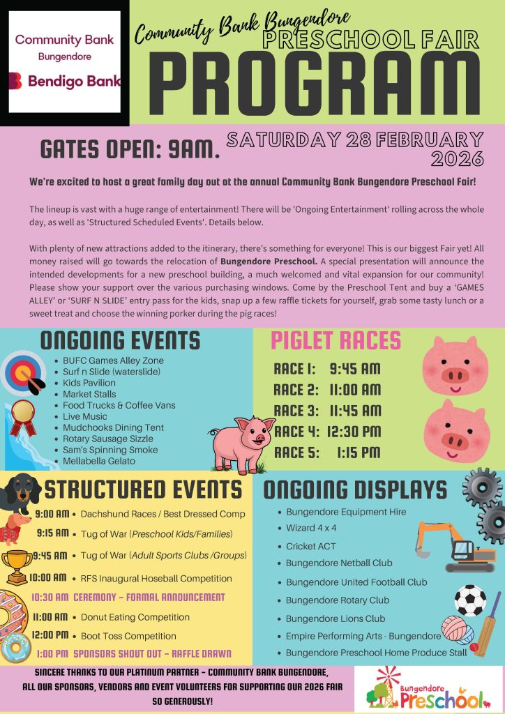 Back for our fourth year running, the Community Bank Bungendore Preschool Fair & Pig Races has become one of Bungendore’s favourite community days — a big, joyful mix of stalls, activities, laughs, and (yes) the legendary pig races, all raising funds for our beloved not-for-profit preschool. After the event was recognised locally as Event of the Year in Bungendore, we’re excited to do it again — this time on Saturday 28 February 2026 at Mick Sherd Oval, with gates opening from 9:00 am.